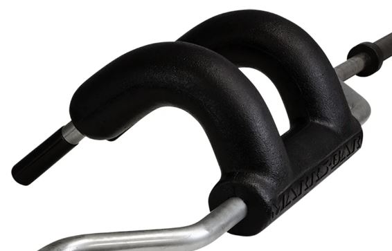 This is the Marrs Bar: a safety squat bar that limits the load on the neck and back, reducing stress on your spine, shoulders and knees. It is great for people recovering from an injury but can also be used for those who want to have a more comfortable exercise. It has enough padding to redistribute the weight through its harness padding.