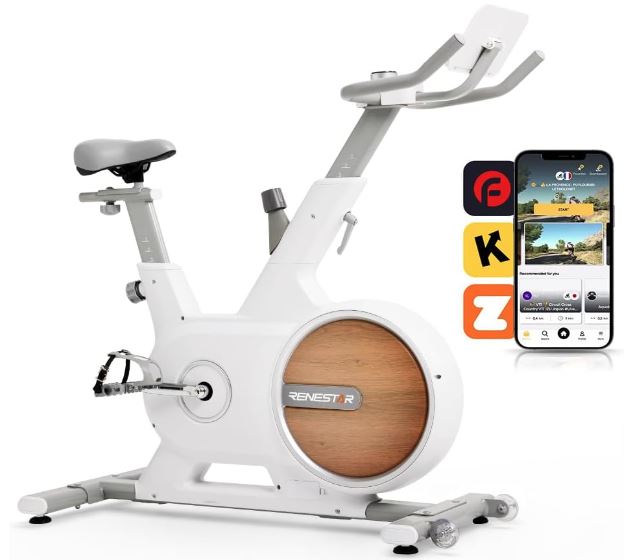 Here is another exercise bike with Bluetooth that gives you a fun workout indoors. The RENESTAR Magnetic Exercise Bike has 32 levels of magnetic resistance. It supports users up to 300lbs. You can adjust the resistance level by twisting a knob. You can use this bike with Fitlog, Kinomap, and Zwift.