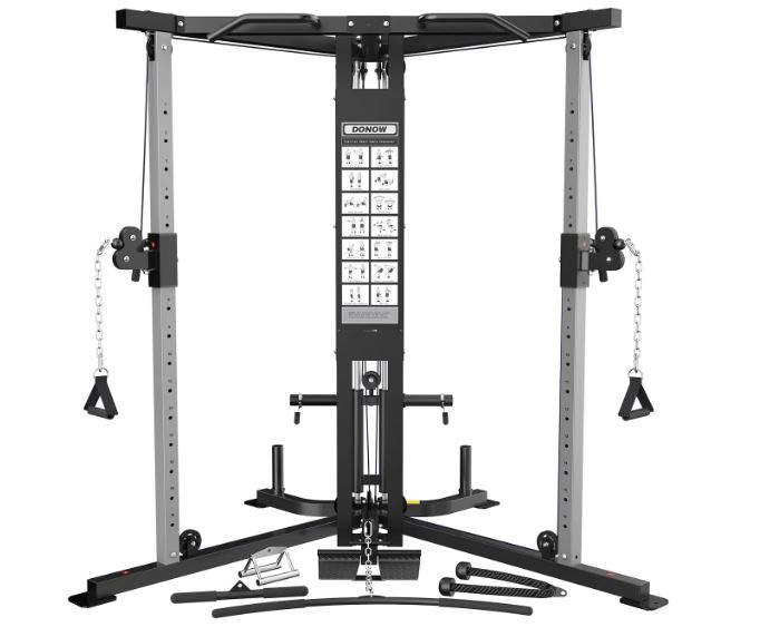 This is the DONOW Cable Crossover Machine: a home gym system with everything you need to take your strength to the next level. It has a 15-gauage thick commercial steel construction. It comes with a triceps rope, seated row/chin bar, lat bar, and a revolving straight bar. It has 16 height settings for you choose from.