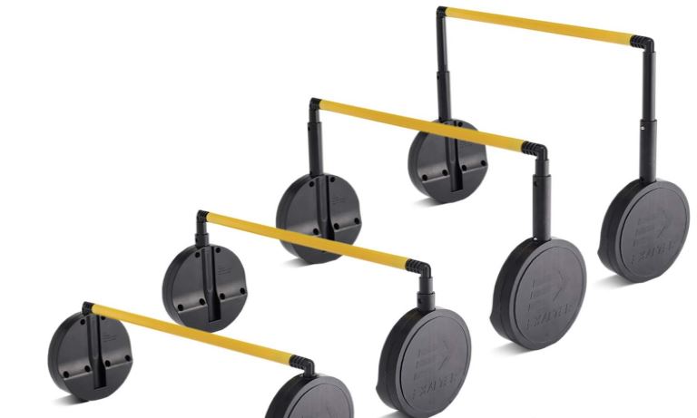 Here is a set of hurdles that you can use for agility training. The EXALTER Agility Training Hurdles are height adjustable from 7 to 15 inches. These are easy to set up for drills. This set comes with 12 bases and 6 ABS rods. The circular bases make sure the hurdles stay put as you exercise.