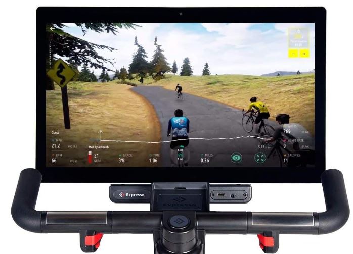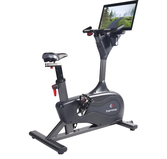 This is the Expresso GO: another high-end exercise bike with a touchscreen display for interactive workouts. The Expresso GO has a 24-inch HD touchscreen display. It is ready for virtual training and gamified workouts. This smart bike handles users up to 350lbs. It can handle riders from 4′ 11″ to 6′ 6″.