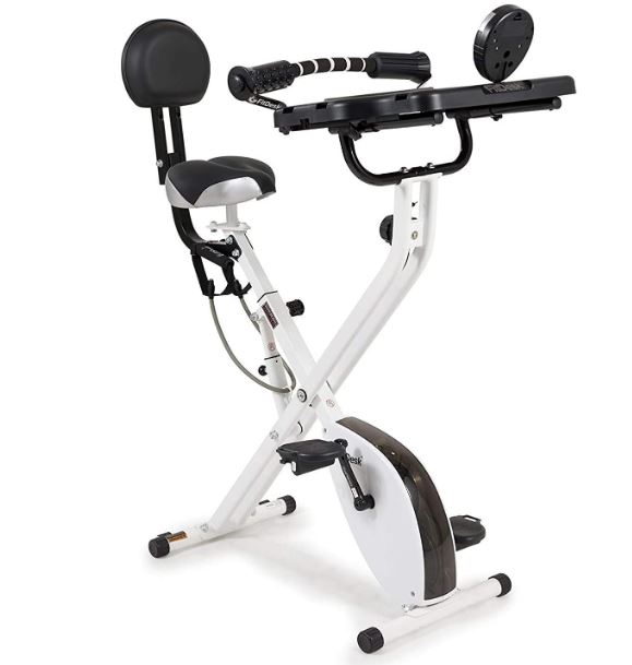 This exercise bike lets you use resistance bands to work your body harder when you are not typing. It has an adjustable backseat. You also get a tablet holder. Its desk has a footprint of 16 x 19″. This entire bike weighs under 5lbs, so you can easily move it around.