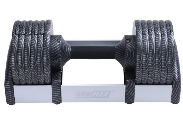 The GR8FLEX dumbbell lets you adjust weight by turning the handle. It is made with steel and hardened plastic.