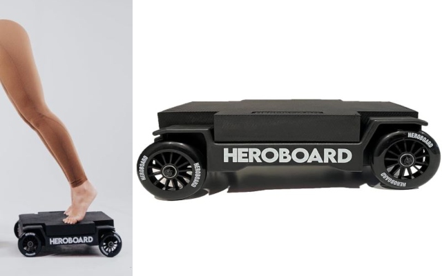 This is the Heroboard: a versatile core trainer and portable pilates reformer that can work your major muscle groups and give you a full body workout anywhere. It has a foam exercise pad to keep you comfortable. There is also a raised heel to protect your knees. This ab trainer has large wheels that allow for smooth movement.