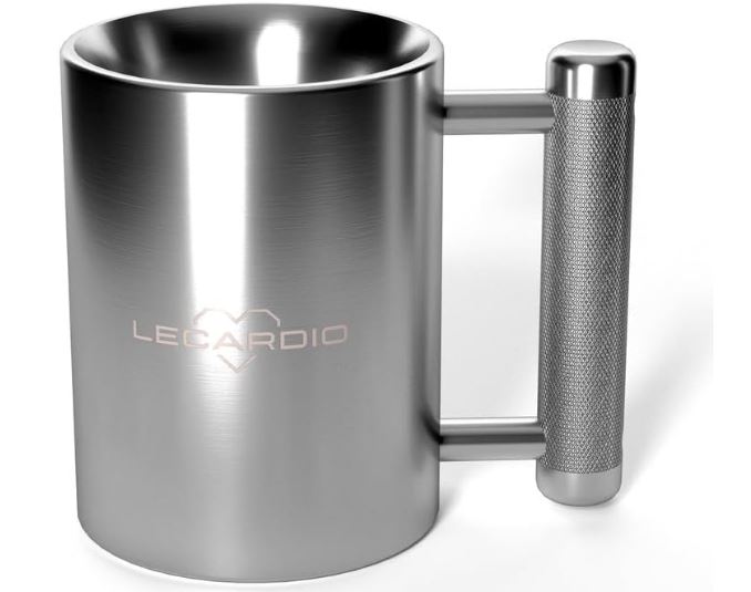 This is the Lecardio Heavy Mug: a stainless steel mug that gives you a workout as you lift it. It tests your strength as you pick up to have a drink. It has 10.2oz capacity. It has a comfortable grip with a strong connection that doesn’t break, so you can move this around safely.