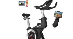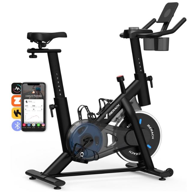 Here is another affordable indoor bike that combines with your phone to give you a fun workout indoors. The Merach Bluetooth Exercise Bike is compatible with Kinomap and Zwift. It can handle up to 270lbs of load. It also has a convenient device holder as well as a dual-slot bottle holder.