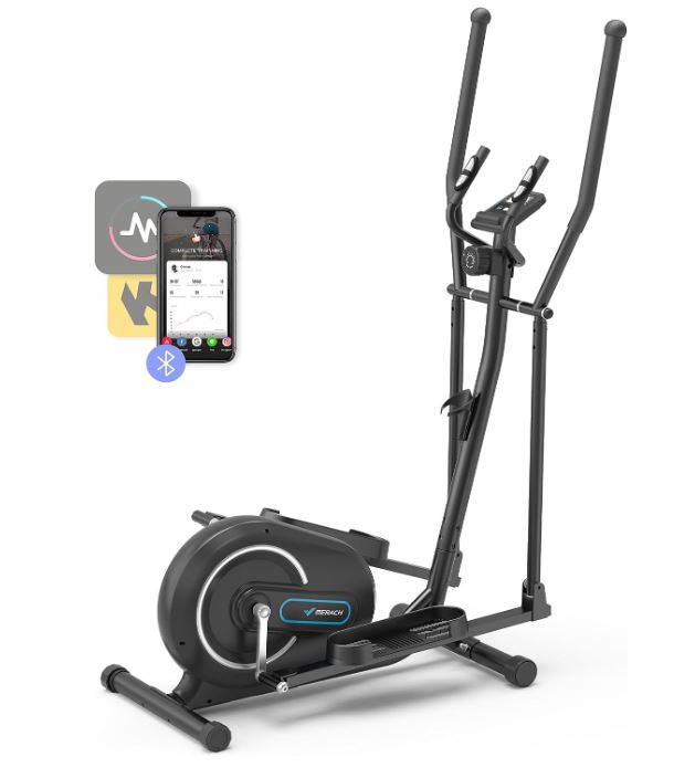 Meet the Merach E07 Elliptical: another app connected cross trainer that gives you a low impact cardio workout. It has 15.5-inch stride length with max weight capacity of 265lbs. It has a high-density carbon steel construction. It works with Kinomap and Merach apps. It has 16 levels of magnetic resistance.