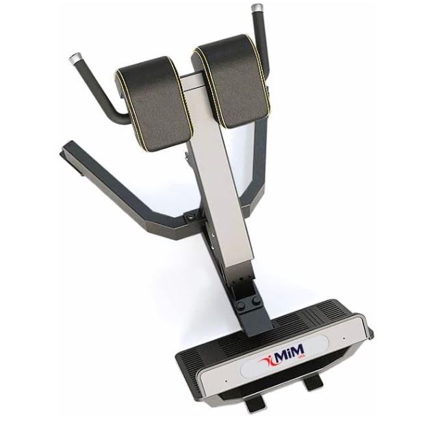 This is the MiM Commercial Roman Chair: a professional fitness tool that helps you take your back extensions, waist bends, and other favorite exercises to the next level. It has 400lbs weight capacity. It has a footprint of L 52″ W 34″ H 60″.
