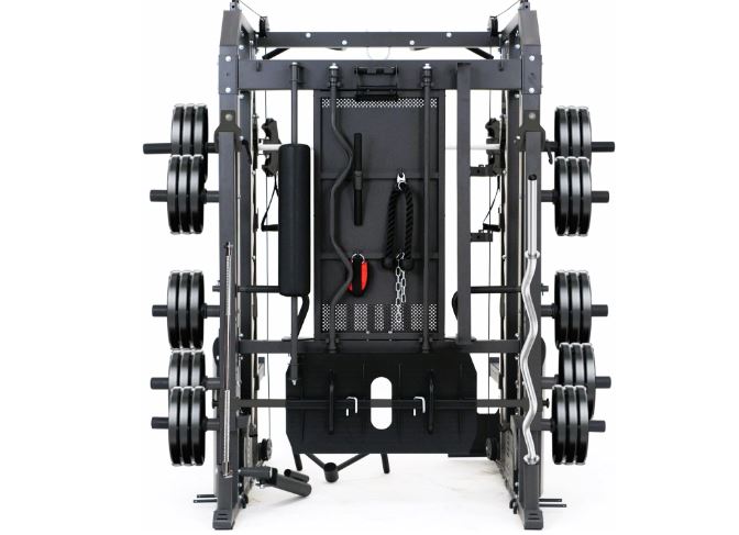 Meet the MIM USA Hercules Pro: a commercial smith machine and functional trainer that comes with everything you need for serious training. It comes with a power rack, dip station, chin-up/pull-up station, core trainer, lat pulldown and vertical leg press. It also has an adjustable pulley system, so you can adjust the cable pulley resistance from 1:1 to 2:1.