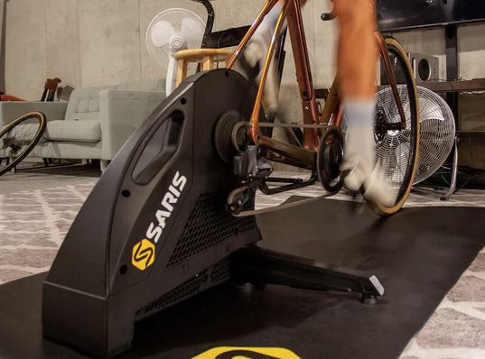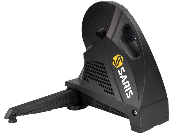 This is the Saris H3+: a 12-speed indoor bike trainer with Bluetooth and ANT+ connectivity that helps you work your body hard indoors. It comes with electromagnetic resistance. It coms with a direct drive system to eliminate tire wear. It has a 20lbs flywheel and foldable legs.