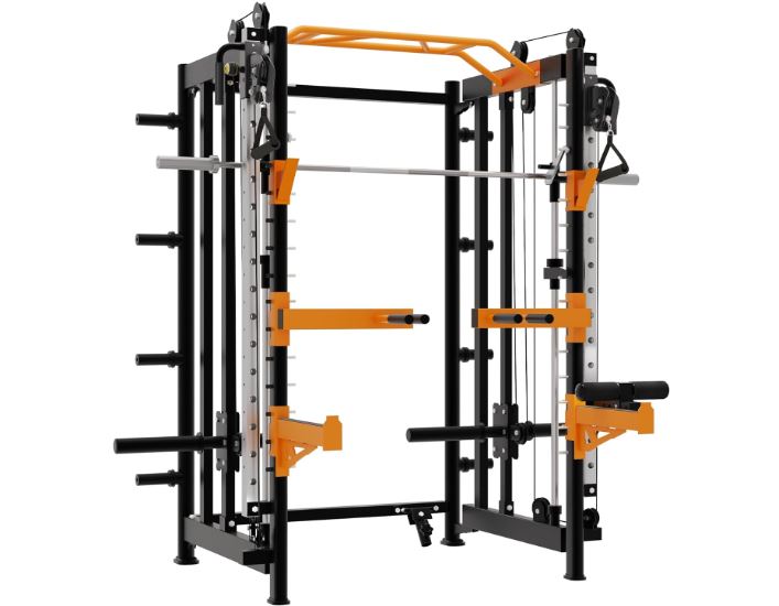 This home gym comes with various attachments, including J hooks, landmine, V-bar, and pull-up bar. It has a safety catch for protection. It comes with ample support for your knees.