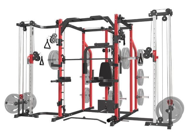 Meet the SPART Multi-Functional Power Cage: a giant exercise machine with everything you need for serious strength training. This home gym comes with a power rack, squat rack, smith, lat pull down, and cable crossover machine. It has a commercial grade construction with heavy-duty steel frame. This power cage is rated up to 2000lbs.