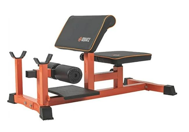 This is the SQUATZ Sissy Squat Machine: a foldable squatting bench that helps you train your thighs, glutes, and lower body. It has an ergonomic design and can be adjusted to accommodate different body shapes. This bench has max weight capacity of 440lbs. It also has a large footplate for safe workouts.