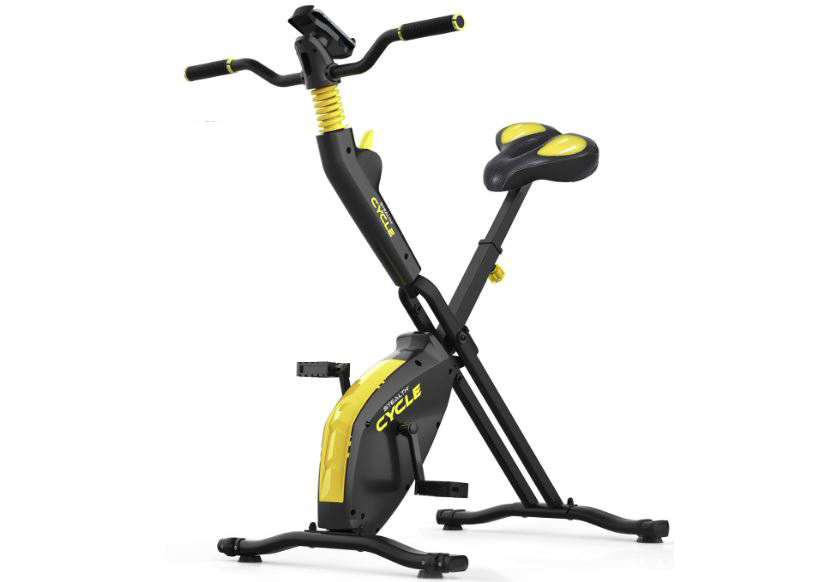 This is the Stealth Cycle: an app connected X-bike with Bluetooth connectivity that gamifies workouts. It comes with a dynamic upper body trainer that works like a game controller to tone your arms, chest, and shoulder. This bike connects to the Stealth Fitness app for games.