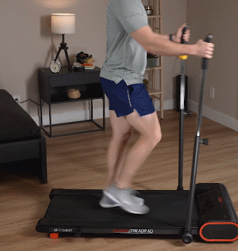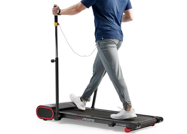 Here is a slim under desk treadmill with trekking poles that works your body even harder. The Sunny Health & Fitness Smart Trekpad Treadmill comes with app connectivity. It has adjustable speed from 0.5 to 3.7mph. This treadmill connects to your phone via Bluetooth to give you access to 1000+ workouts.