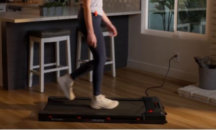 This treadmill can handle up to 245lbs of load. It combines with the SunnyFit app for guided workouts and 10k routes. You get a remote control for easy speed adjustment. Treadpad 100 is compact enough to easily fit under your desk. It has shock absorption for a low impact workout.
