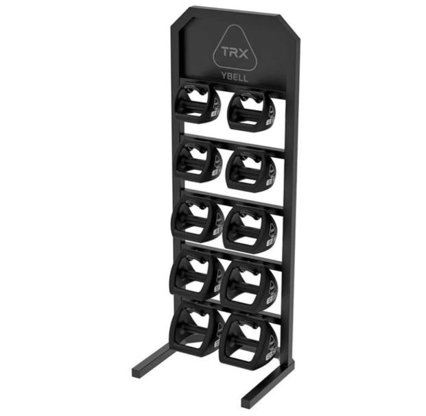 This vertical rack has a footprint of 21 x 19 x 59 inches. The TRX YBell is quite clever, with outer kettlebell grips. You can change your grip to shift weight distribution and switch mode. You can use these weights as a double grip medicine ball.