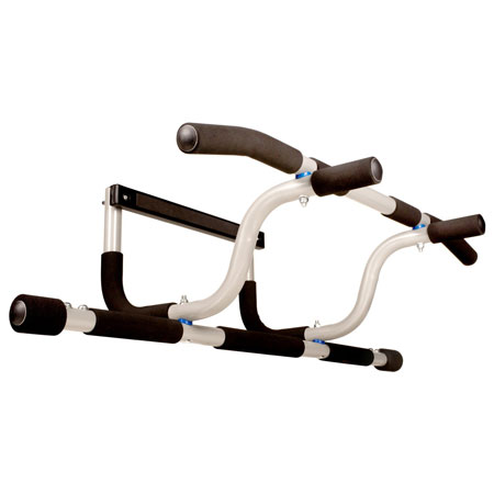 The elevated bar supports up to 300 lbs in weight. It fits doorways 24 to 36 inches wide. Suspension trainers, ab straps and gymnastic rings are optional.