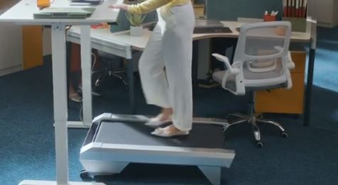 This is the UREVO CyberPad: an under desk treadmill that combines with your phone to get your more active at work. It has a 2.5HP brushless motor and 14% inclined angle. It has an adjustable temperature from 0.6 to 4mph. It has a remote control with a digital display.