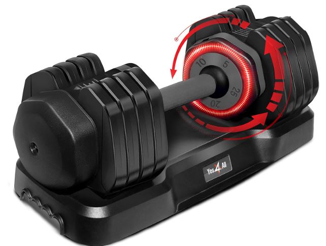 Dumbbells are great for strength training but they do take some space, especially as you buy more ones to get stronger. The Yes4All 25-55 Adjustable Dumbbells can replace 5 sets of dumbbells. You can change weight in 5lbs increments with a twist. It has a locking mechanism that keeps the plates in place. You can use these for shoulder presses, squats, deadlifts, and a lot more.